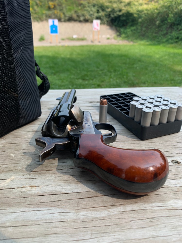 We used CCI aluminum cased jacketed hollow points for our range session. The Thunderer functioned flawlessly. All shooting was done between five and ten yards, dominant hand only. Again, for the rudimentary sights, group size was quite good. Staying with the wild west, rustic theme, group size was measured with the barrel as our measuring stick. All groups, at all ranges, stayed under the length of the barrel, so under 3.5 inches. Because of the balance of the Thunderer in the hand, even when point shooting without looking at the sights, shots stayed clustered around the intended point of impact. The Thunderer’s distinctive grip played a big part in this, because it allows the hand to stay firm while thumbing back the hammer, without needing to readjust to squeeze the trigger. Consistency allows accuracy. It also minimizes muzzle rise between shots, and while thumbing the hammer back, and also helps tame recoil.