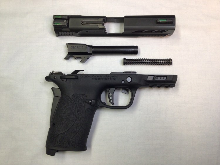 Disassembly of the pistol is very straight forward and uncomplicated. Start by removing the magazine and locking the slide to the rear. Make a visual and tactile inspection of the chamber to ensure the pistol is clear. With the slide locked back, the take down notch in the slide automatically aligns with the take down lever on the frame. Rotate the lever downward, unlock the slide and bring it forward off the frame. Once the slide is separated, press the recoil spring forward and remove it from the slide. With the recoil spring removed, the barrel can then be lifted out of the slide as well. That’s it. Reassemble in reverse order, taking care to align the slide with the frame rails, and lining up the frame mounted ejector with the cutout for it on the rear of the slide.
